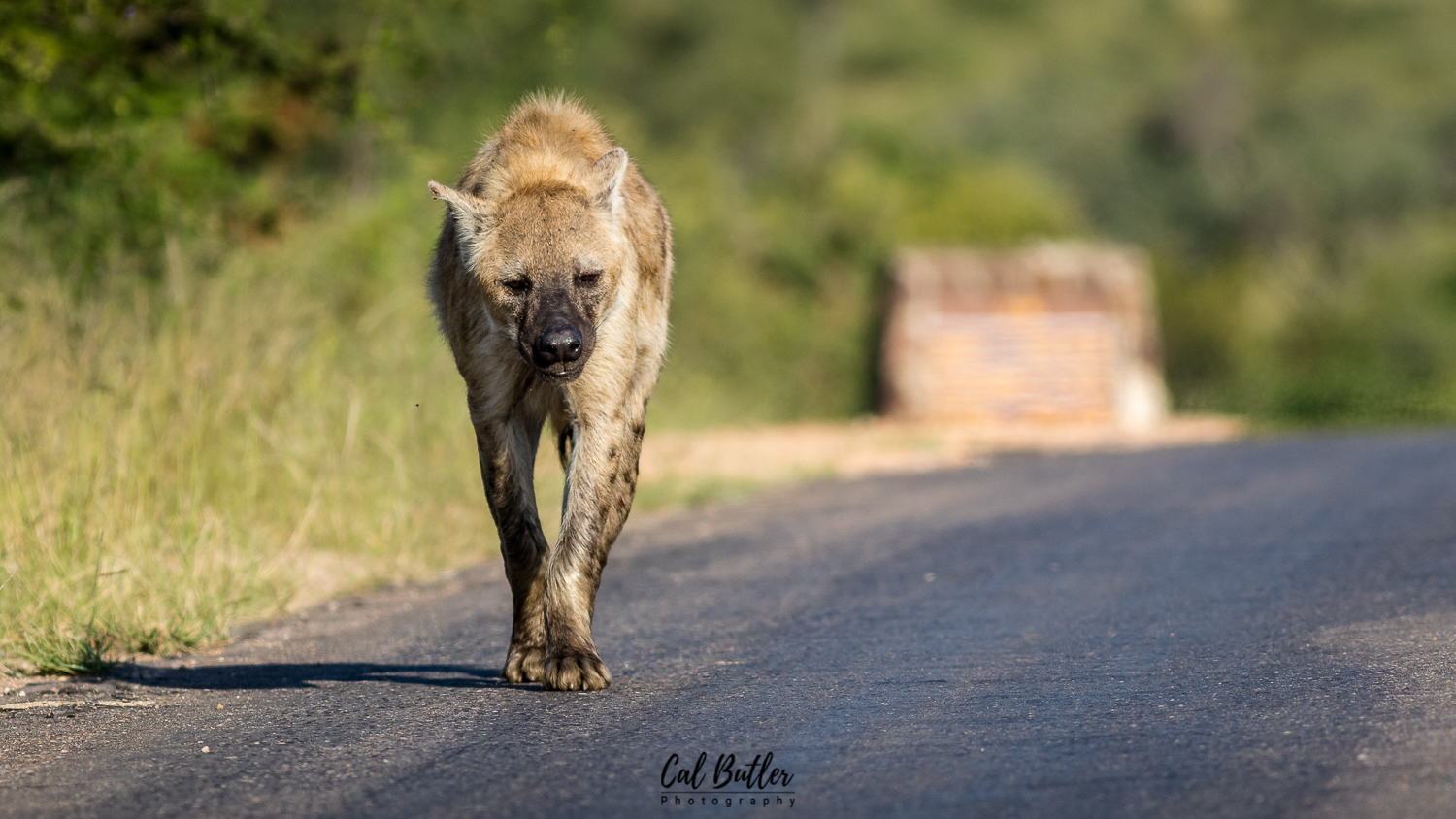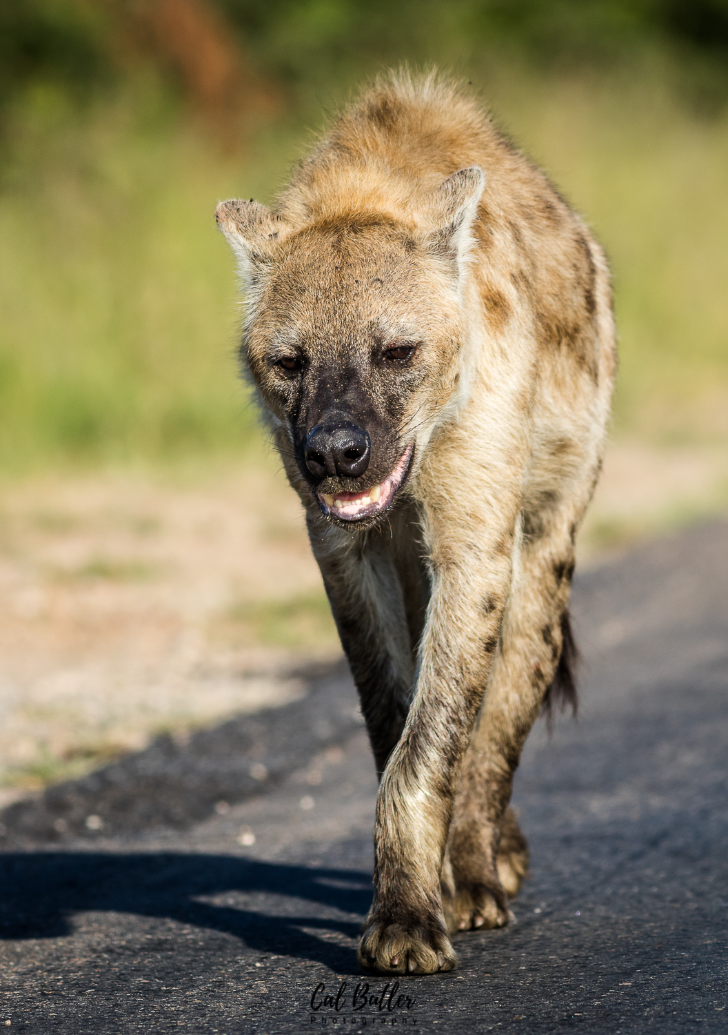 I managed to enjoy a fun walk by from this lone hyena just before I exited the park. Another vehicle passed by me and asked whether I had seen any wild dogs (aka painted wolves) in the immediate area. I had not, but wondered whether this hyena was en route to the wild dogs. The vehicle moved on and I continued following the hyena. It did indeed lead me to the wild dog pack. As it was midday, the wild dogs were resting in a Tamboti tree thicket and visibility was not great at all.