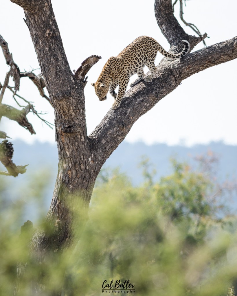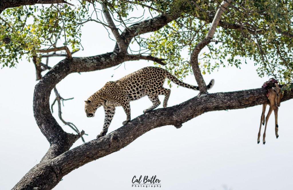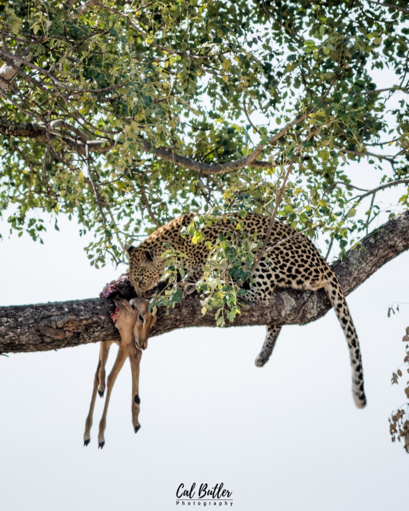 The sighting did not last long, but I managed to watch the leopard feed a little. Once it had fed enough, the leopard moved off the carcass and proceeded to groom itself. Satisfied with its hygiene standards and two good stretches later the leopard made its way down the mighty Marula tree. Watching how swiftly a leopard moves up or down a tree is always a treat.