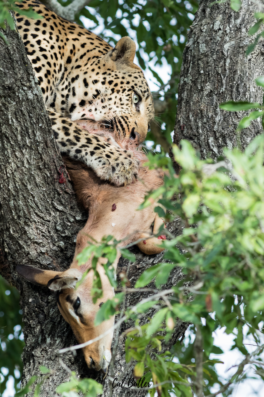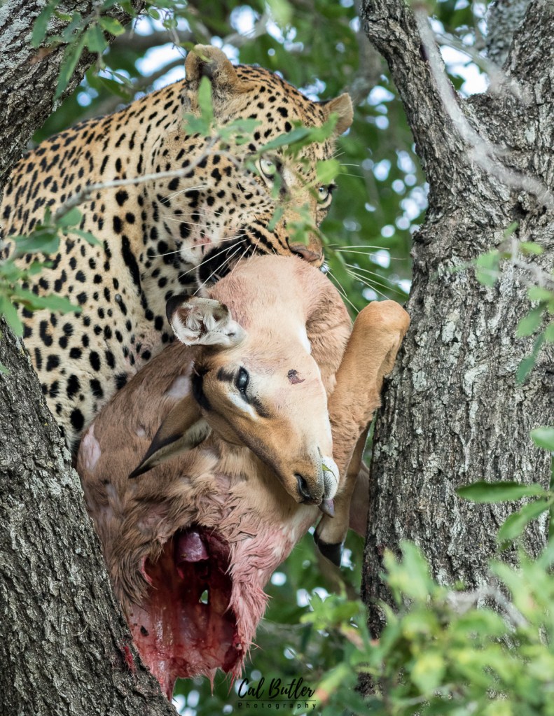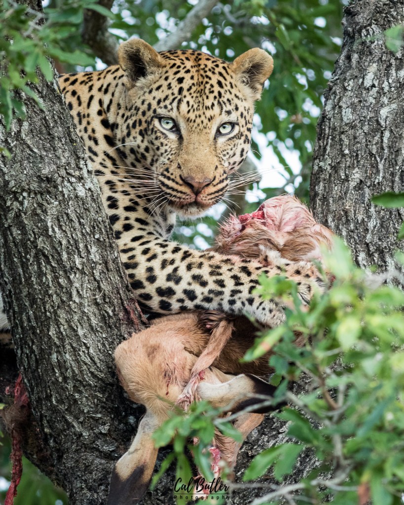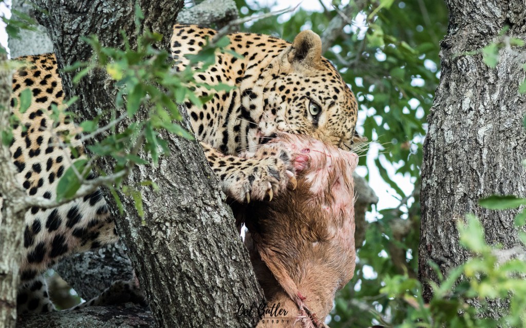 The handful of sightings I have shared with this male have been fleeting glimpses on the ground. I recently had the fortune of spending time with Euphorbia feeding high up in a tree. He casually fed on an impala that fell victim to this stealthy predator during a dark and windy night.