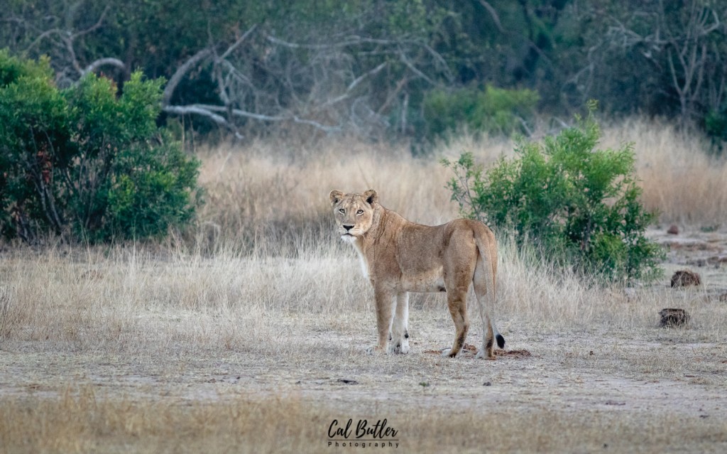 We saw a lioness emerge from the river bed and she made her way through the thickets out into an open clearing. She stood for a moment, scanned the environment and then settled down close to where we were stationed. This alone would have been an amazing experience. Then, another lion emerged.