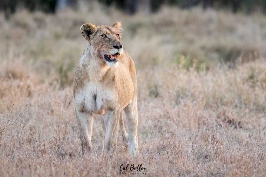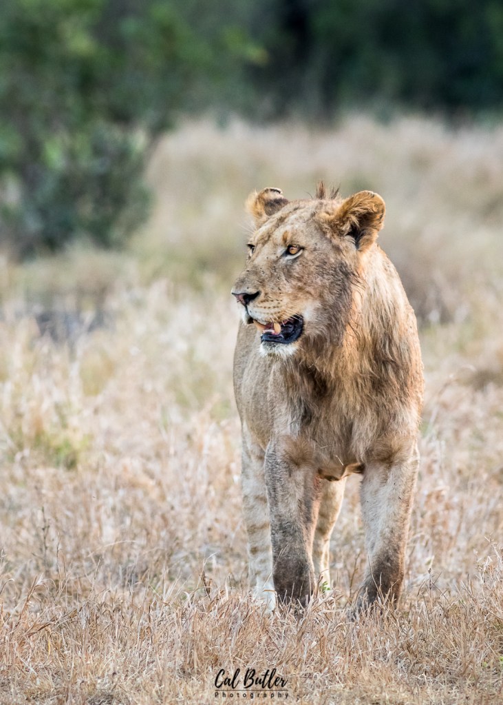 By the time we had made a U-turn, the temperature already started to drop a little. The sun sat lower on the horizon and a gentle hue started to develop. We bypassed the elephant herd from before. Then, not long afterwards, my dad proclaimed “a lion!”